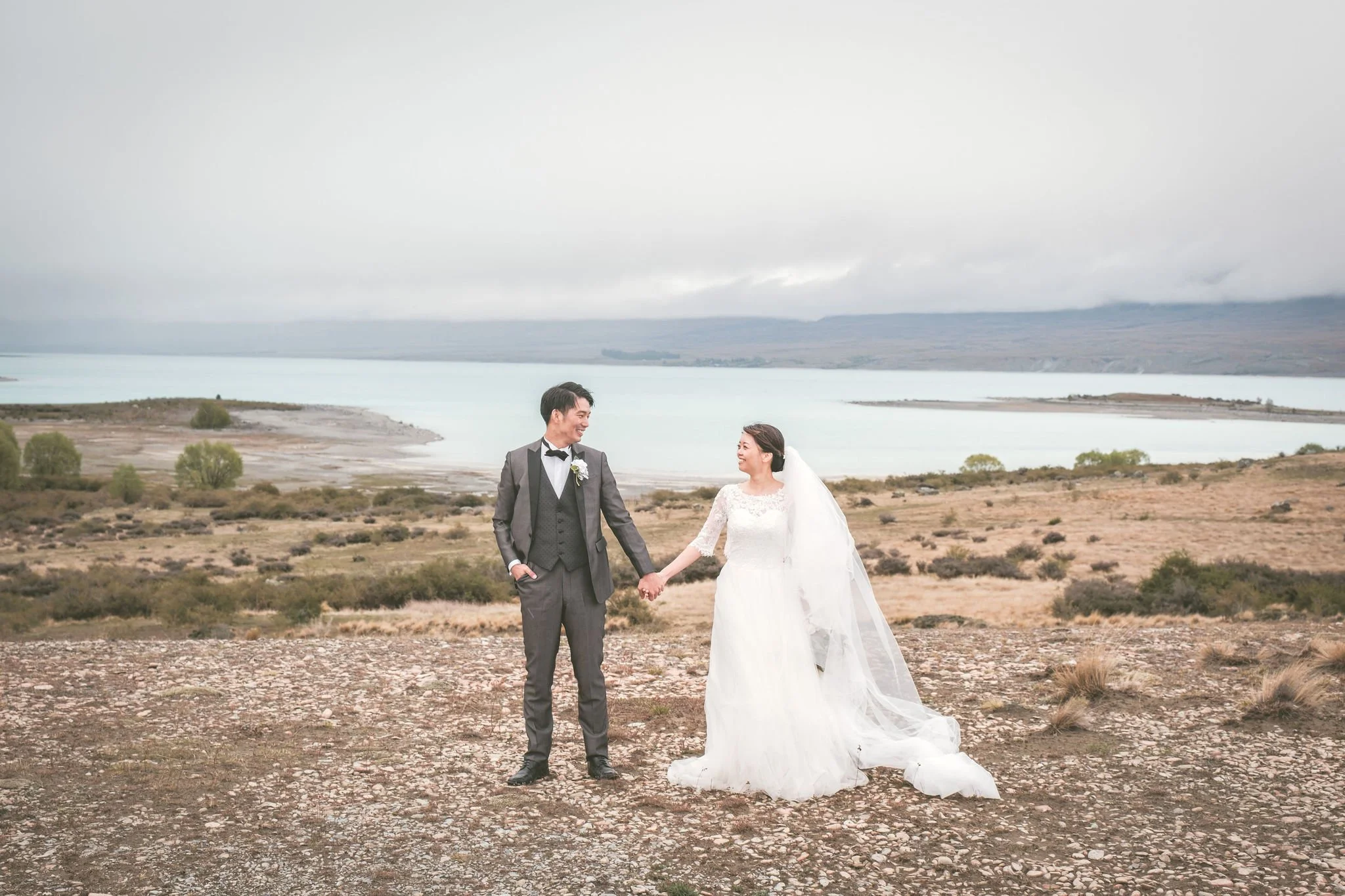 The weather in Tekapo for our shoot was a little stormy, but that just added to the atmosphere and the incredible backdrop for their wedding portraits. Lake Tekapo is super popular with Japanese visitors and tourists from all over the world due to the snow capped mountains, turquoise blue waters and the cutest lakeside church in the southern hemisphere - The Church of the Good Shepherd. Taka + Aimi were so excited to finally be here in NZ after looking forward to this trip for such a long time. They got married in Japan during the pandemic and had promised themselves a trip to New Zealand to celebrate their wedding. We were the lucky NZ destination wedding photographers who were honoured to do their wedding portraits for them in New Zealand.